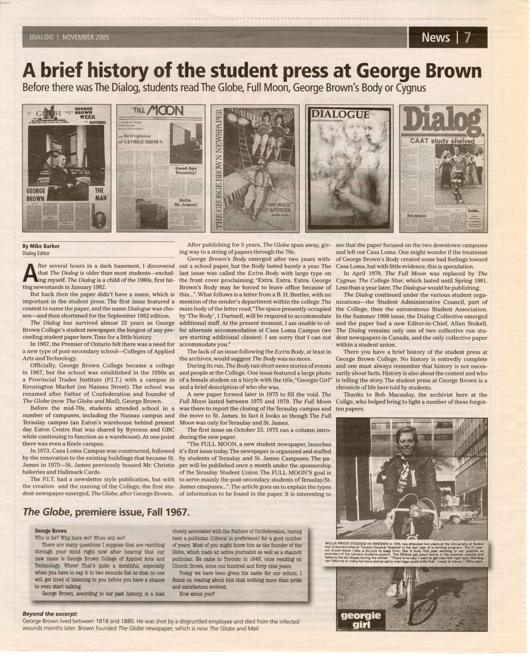 However, our story is part of a longer tradition of campus journalism that dates back to 1967, predating our establishment. This rich history is fitting given that the college is named after a luminary in the journalism field, the founder of the Globe and Mail. Join us as we trace the progression of media at George Brown College, explore the origins of The Dialog, and discuss our vision for the future.